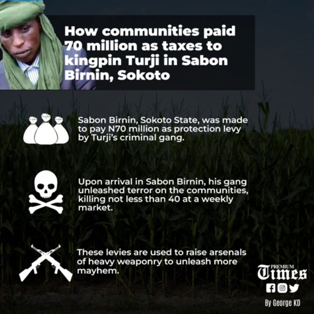 Upon his arrival in Sabon Birnin, his gang unleashed terror on the communities, killing not less than 40 at a weekly market. He then took over several villages and hamlets.Following the order, residents of 42 affected communities in Sabon Birnin paid N70 million to Turji’s criminal gang, locals who gathered and delivered the money in cash told PREMIUM TIMES, asking not to be named.