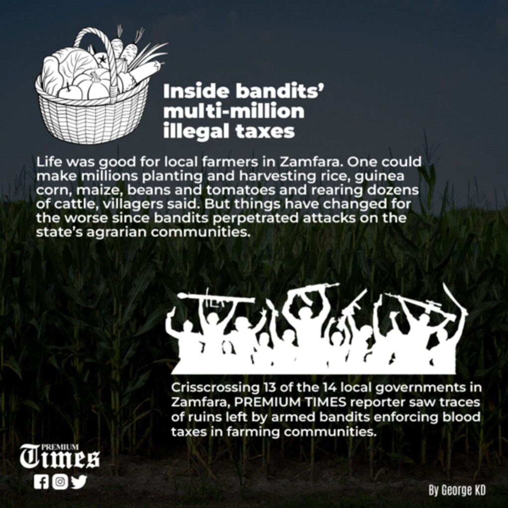Crisscrossing 13 of the 14 local governments in the state, the PREMIUM TIMES investigative team saw traces of ruins left in the farming communities by armed bandits — Maradun in the south, Zurmi in the north, as well as Shinkafi and Kaura, the economic and social areas of the state. By many accounts, bandits impoverish farming communities — and enrich themselves — imposing taxes on locals and ruining their economies.